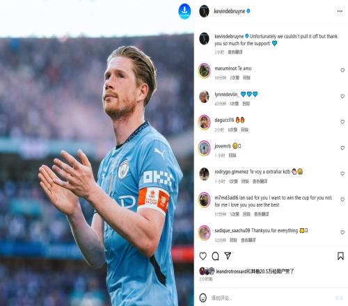 赛后德布劳内更新社媒,晒出自己向球迷鼓掌致意的照片,并配文写道:“尽管很遗憾我们未能捧起这个冠军,但还是非常感谢你们的支持。”